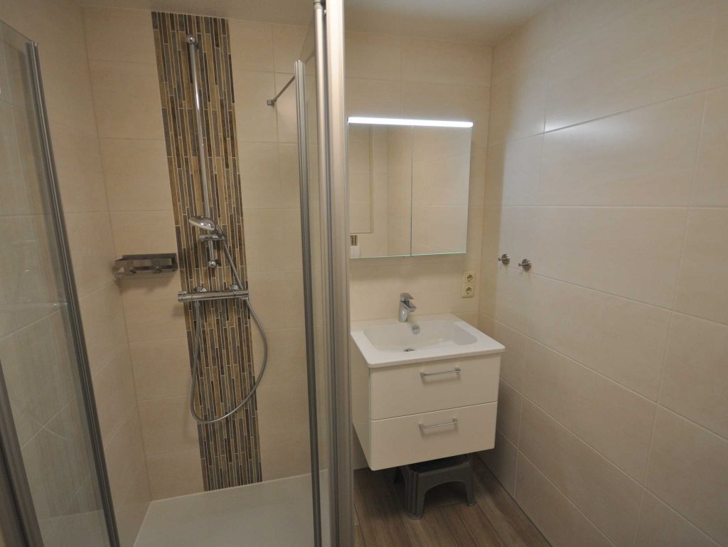 Im komfortablen und modernen Badezimmer findest du eine ebenerdige Dusche, eine erhöhte Toilette und eine zusätzliche Fußbodenheizung.